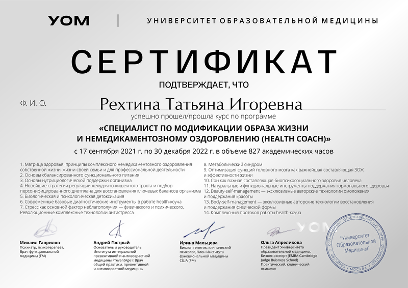 Я, Татьяна Рехтина, эксперт в области красоты и здоровья, ментального и физического. С 2006 года я помогаю людям раскрыть природу их внутренней и внешней красоты. Найти истинный Путь, увидеть особенности, полюбить себя.